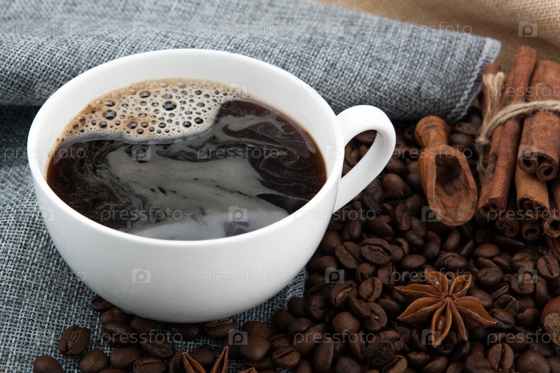 Чашка черного кофе на цветной ткани и жареные кофейные зерна крупным планом