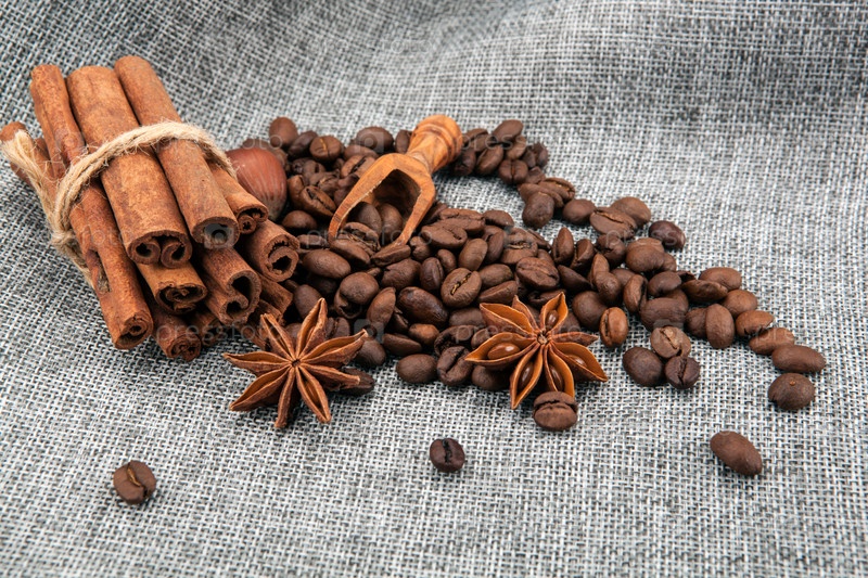 Теплые жареные кофейные зерна на мешковине и крупным планом