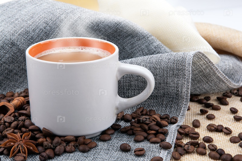 Чашка кофе с молоком на цветной ткани и жареные кофейные зерна крупным планом