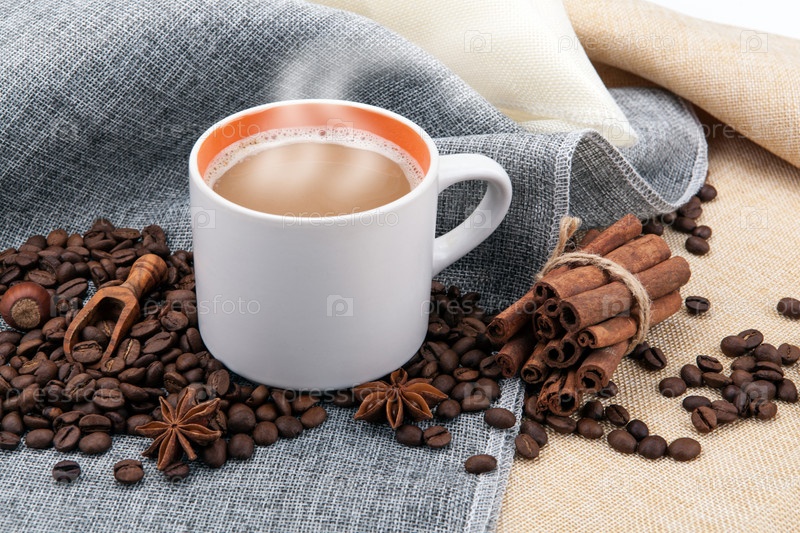 Чашка кофе с молоком на цветной ткани и жареные кофейные зерна крупным планом