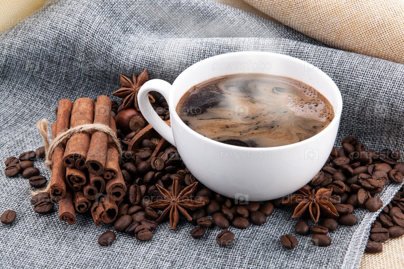 Чашка черного кофе на цветной ткани и жареные кофейные зерна крупным планом
