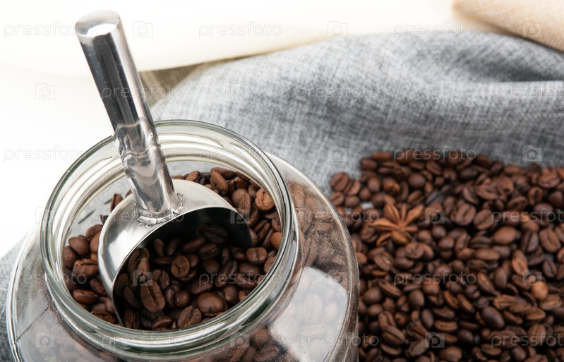 Жареные кофейные зерна с шариком в стеклянной банке на сумке