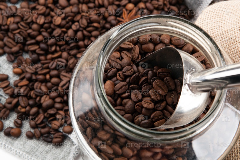 Жареные кофейные зерна с шариком в стеклянной банке на сумке