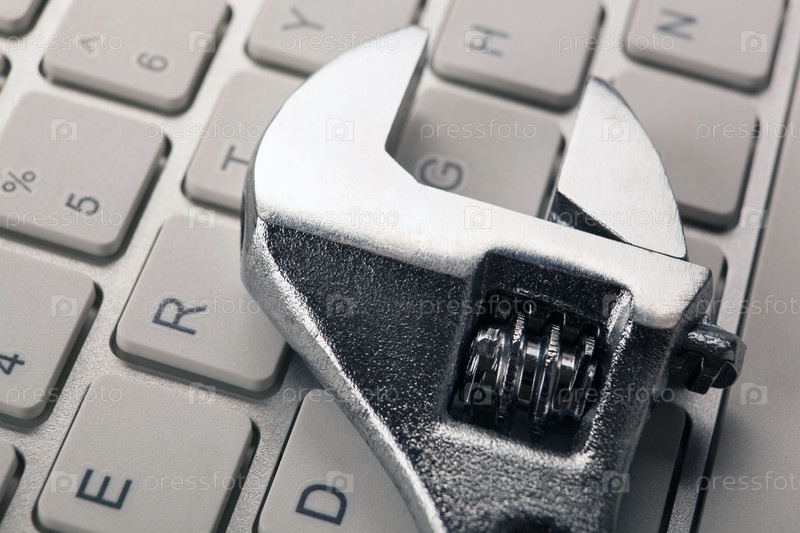 Большой разводной ключ и клавиатура компьютера крупным планом