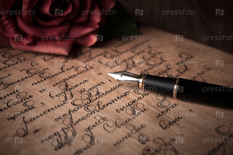 Перьевая ручка на письме с текстом и красной розой
