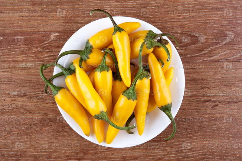 Фрукты желтого свежего перца чили в тарелке на деревянном фоне