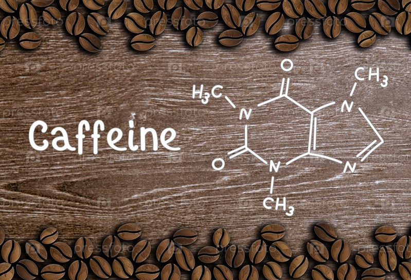 Кофейные зерна с надписью и химической структурой кофеина на деревянном фоне