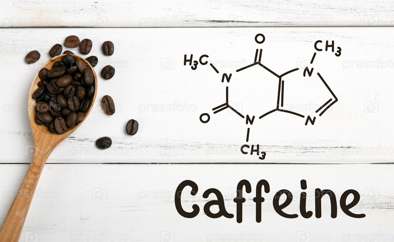 Кофейные зерна с ложкой и химическая структура кофеина на деревянном столе