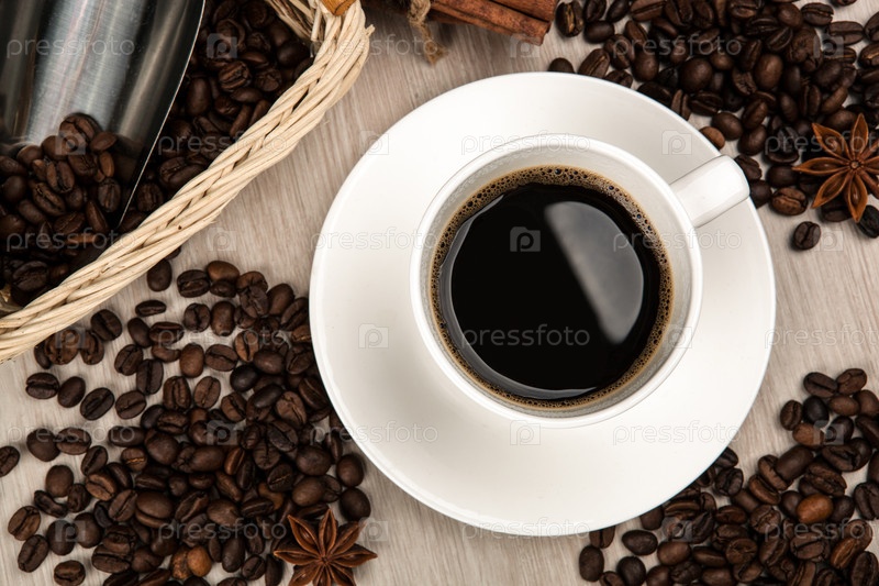Кофейный натюрморт из чашки кофе, зерен