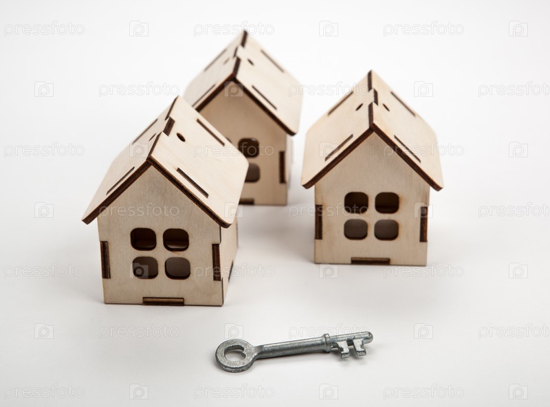 Три деревянных миниатюрных домика и ключ от двери на белом фоне