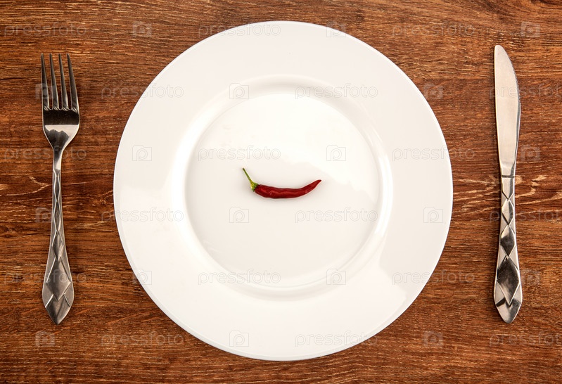 Маленький красный перец на белой тарелке с посудой на столе