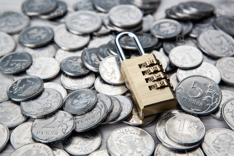 Латунный замок с кодом и монетами российского рубля