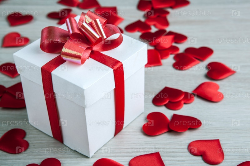Одна белая подарочная коробка на сером фоне и текстильные формы сердца