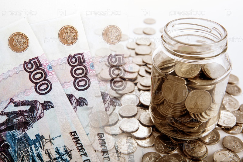 Деловой натюрморт из денег, рублевых купюр и рублевых монет с банком