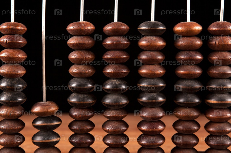 Старинные счеты с костяшками пальцев на столе на черном фоне