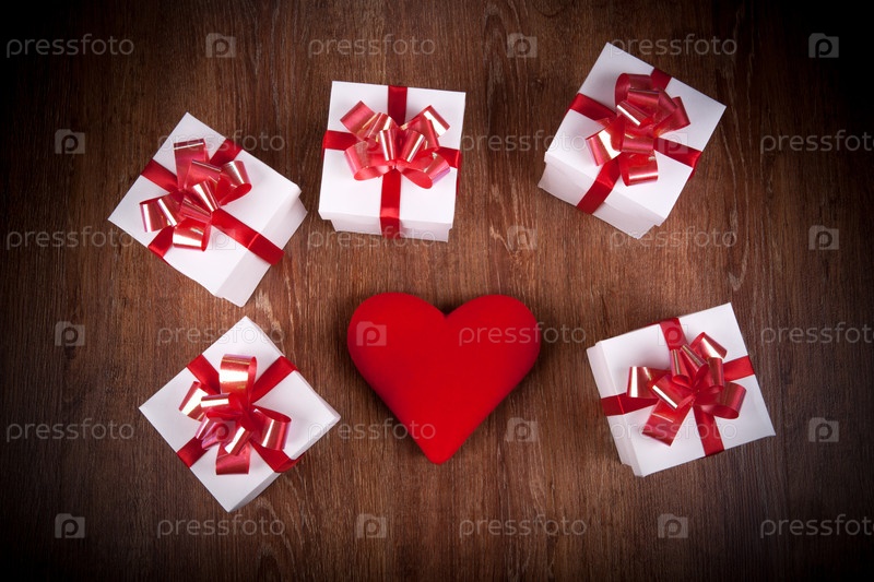 Белые праздничные подарочные коробки с красными бантами на деревянном столе с красным сердцем