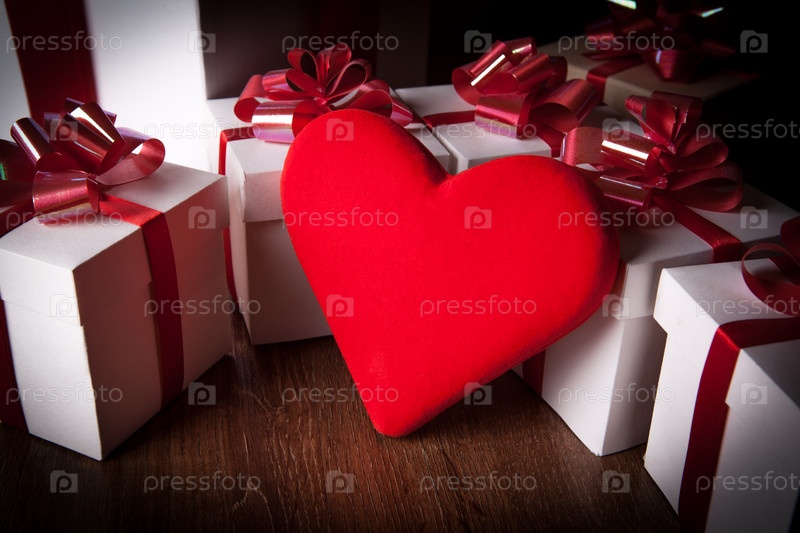Белые праздничные подарочные коробки с красными бантами на деревянном столе с красным сердцем