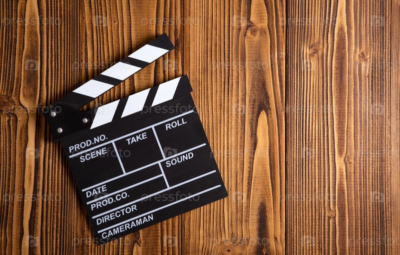 Черная кинохлопушка с белыми надписями на деревянном столе