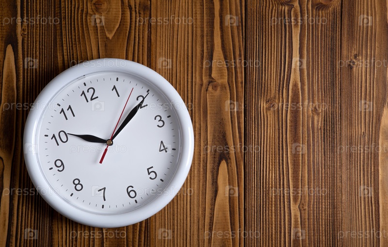 Большой белый циферблат с цифрами на деревянном фоне вид сверху