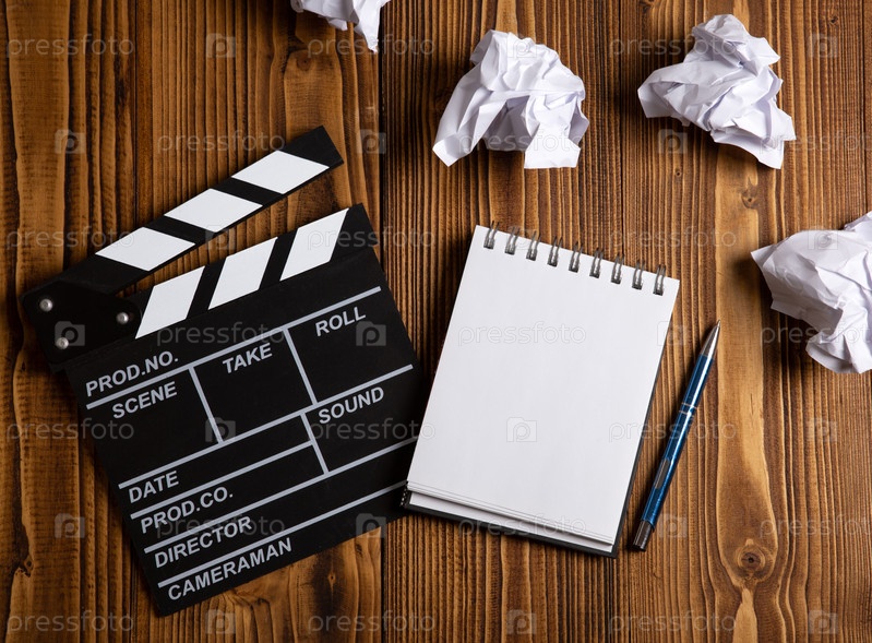 Бумага и скомканная бумага с кинематографической хлопушкой на столе