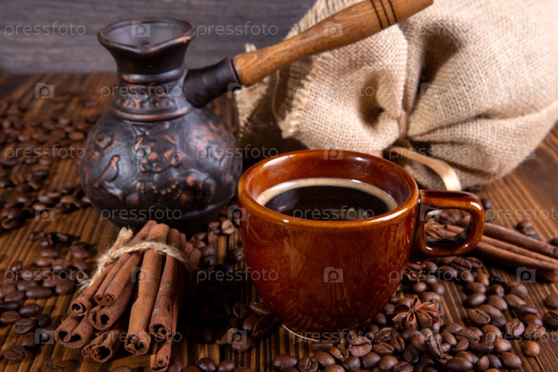 Керамическая коричневая чашка с черным кофе и зернами на деревянном фоне натюрморт