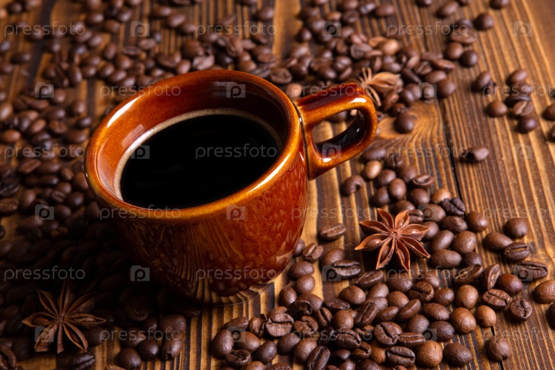 Керамическая коричневая чашка с черным кофе и зернами на деревянном фоне натюрморт