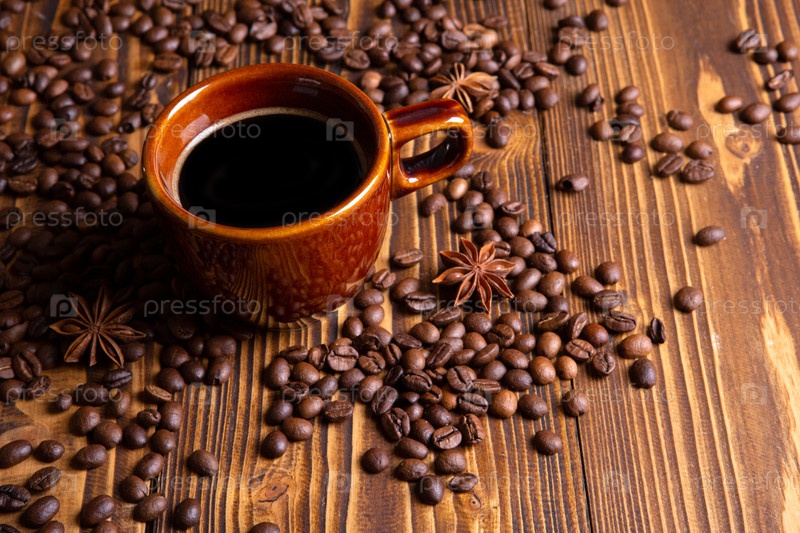 Керамическая коричневая чашка с черным кофе и зернами на деревянном фоне натюрморт