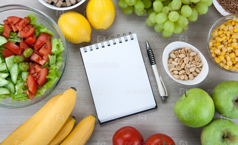 Блокнот с планом диеты со свежими овощами и фруктами на столе
