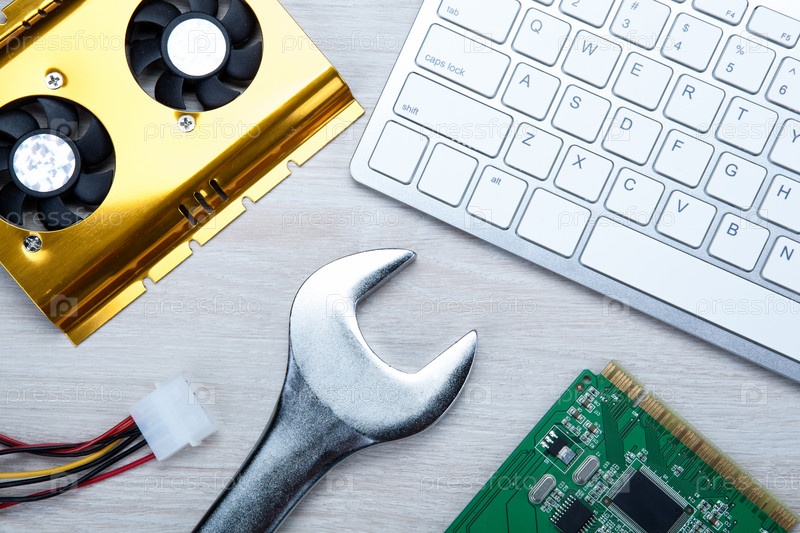 Большой гаечный ключ и компьютерная клавиатура и компьютерные части