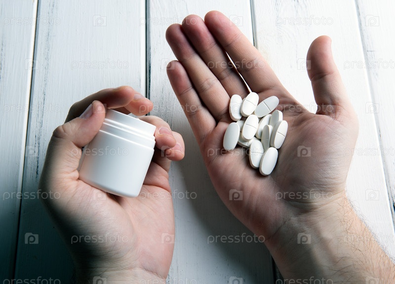 Белые таблетки и банка в человеческих руках на деревянном столе