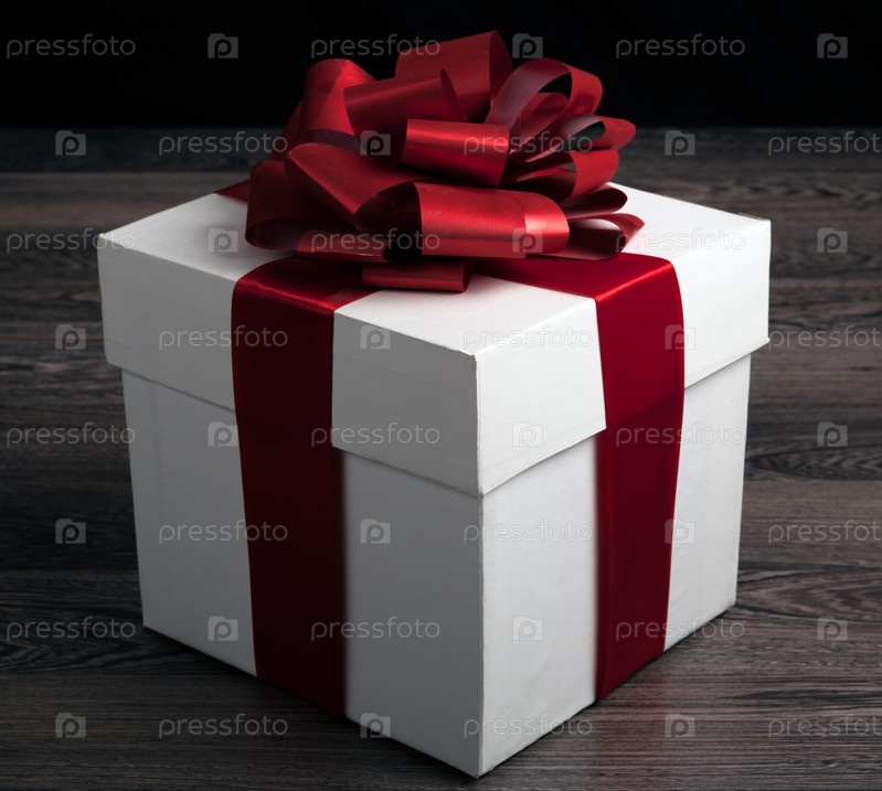 Белая коробка с красным бантом на деревянном столе на черном фоне