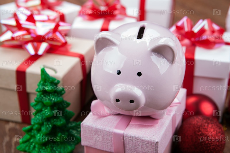 Розовая копилка с елкой и розовой подарочной коробкой