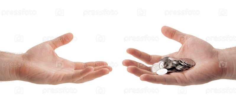 Российские рублевые монеты в ладони человека, который передает в другую руку