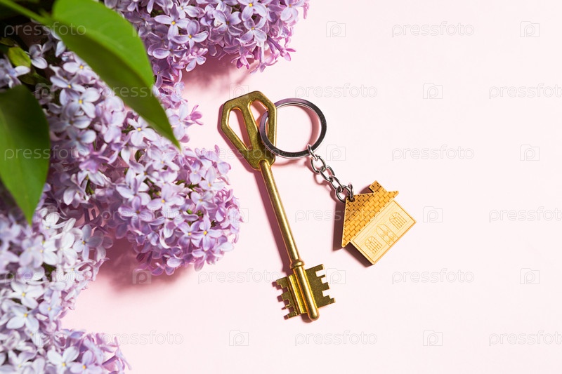 Ключ от дома с брелоком на розовом весеннем фоне и сиреневыми ветвями. Летний загородный дом, бронирование загородного коттеджа, переезд в новый дом, ипотека, аренда и покупка недвижимости