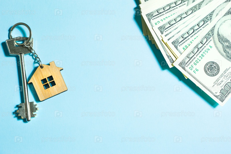 Ключ от дома с брелком на стопке 100-долларовых купюр на синем фоне. Покупка квартиры, дома, недвижимости, бизнеса, ипотека и жилищный кредит в банке, сбережения, наличные, переезд. Копировать пространство