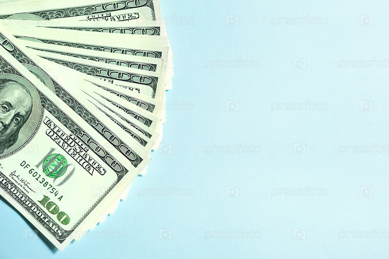 Стопка 100-долларовых купюр на голубом фоне, сто долларов. Концепция Бизнес, финансы, инвестиции, оплата наличными, сбережения и богатство. Копировать пространство