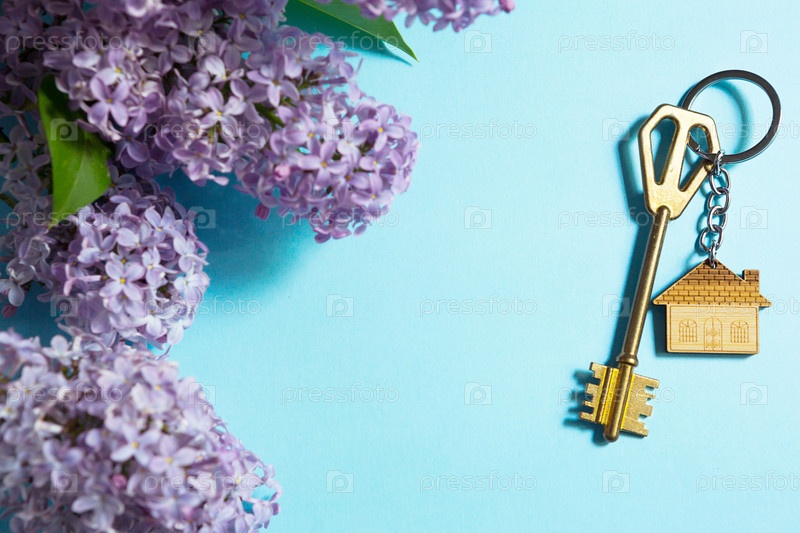 Ключ от дома с брелоком на голубом весеннем фоне и сиреневыми ветвями. Летний дом для отдыха, бронирование коттеджа в сельской местности, переезд в новый дом, ипотека, аренда и покупка недвижимости. Туризм