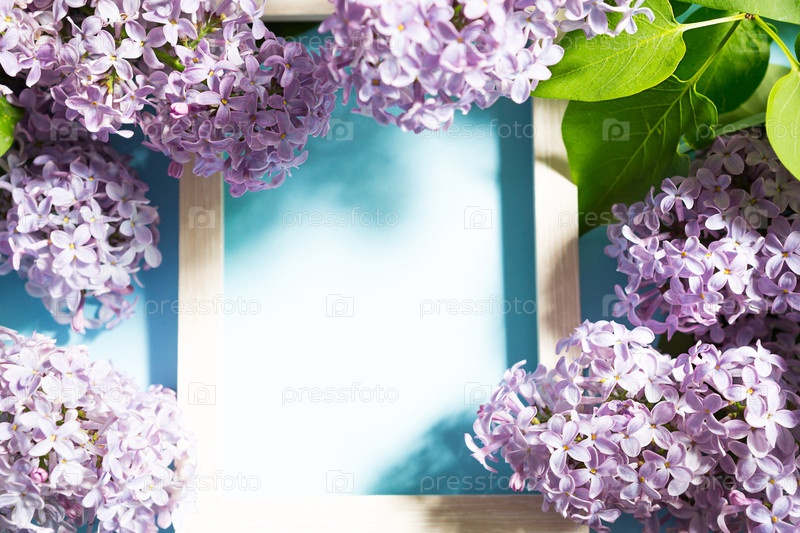 Фиолетовые ветки сирени на голубом весеннем фоне. Рамка с нежными ароматными цветами - начало лета. Праздник 8 марта, Пасха, день рождения, поздравительная открытка