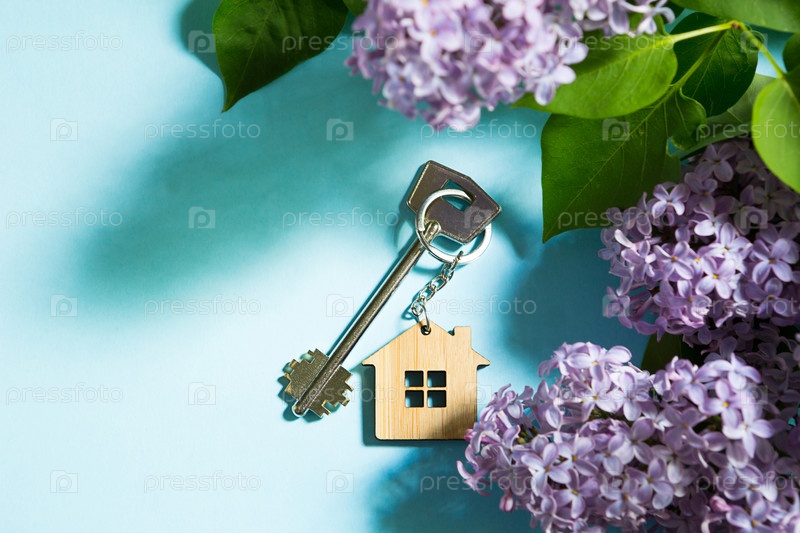 Ключ от дома с брелоком на синем весеннем фоне и сиреневыми ветвями. Дом для летнего отдыха, бронирование коттеджа в сельской местности, переезд в новый дом, ипотека, аренда и покупка недвижимости. Туризм