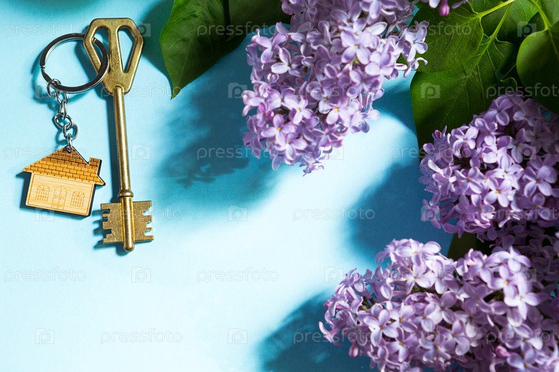 Ключ от дома с брелоком на синем весеннем фоне и сиреневыми ветвями. Дом для летнего отдыха, бронирование коттеджа в сельской местности, переезд в новый дом, ипотека, аренда и покупка недвижимости. Туризм