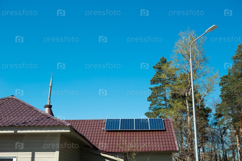 Солнечные батареи на крыше частного одноэтажного дома в сельской местности. Экологически чистое использование солнечной энергии, альтернативного источника. Забота о природе, сохранение ресурсов