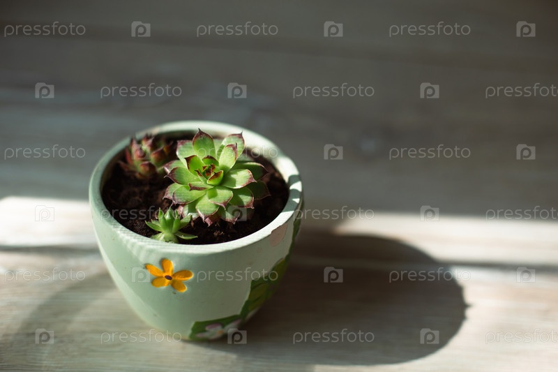Эхеверия в горшке при ярком свете с тенями. Комнатное растение, зеленый дом, суккулент – символ гармонии. Скопируйте пространство. Уход за комнатными растениями