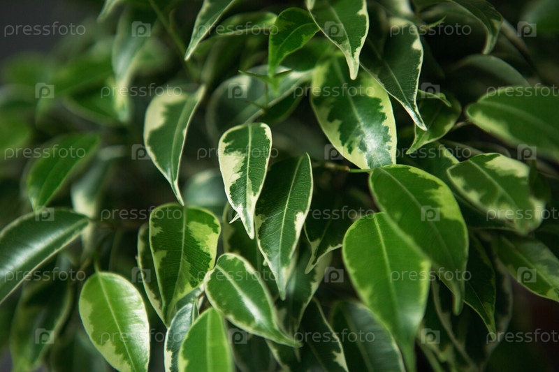 Пестрая листва фикуса Бенджамина в круглом горшке крупным планом. Выращивание комнатных растений в горшках, зеленый домашний декор, уход и выращивание