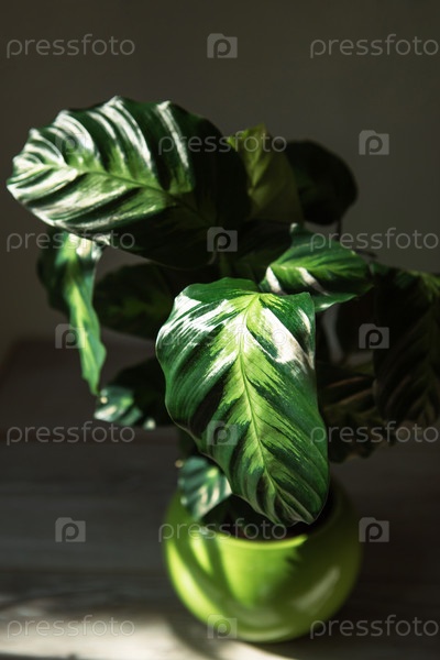 Calathea Lietzei зеленый полосатый рисунок листьев в крупном плане. комнатные растения в горшках, зелёный домашний декор, уход и выращивание, сорта маранто