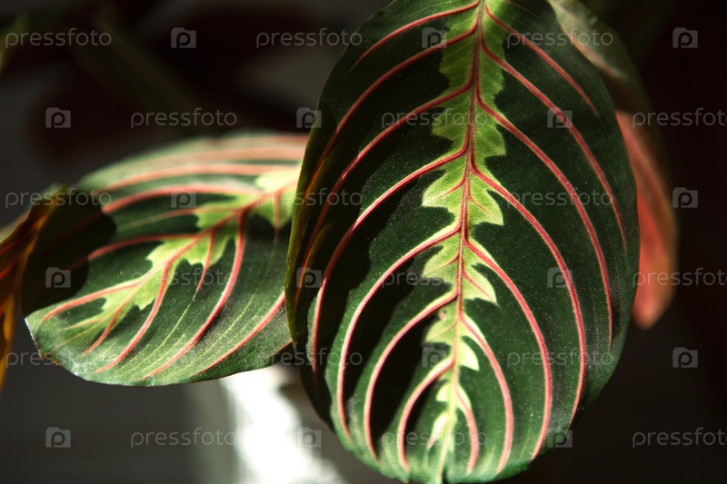 Красивые листья маранты с орнаментом на сером фоне крупным планом. Семейство марантовых – неприхотливое растение. Скопируйте пространство. Выращивание комнатных растений в горшках, зеленый домашний декор, уход и выращивание
