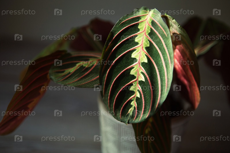 Красивые листья маранты с орнаментом на сером фоне крупным планом. Семейство марантовых – неприхотливое растение. Скопируйте пространство. Выращивание комнатных растений в горшках, зеленый домашний декор, уход и выращивание