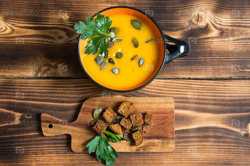 Тыквенный суп в миске с семенами и петрушкой на деревянном фоне. Крекеры со специями на доске. Копировать пространство