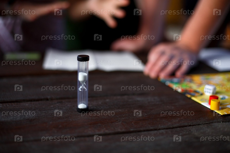 Настольная игра, куб, таймер на темном деревянном столе и руки на заднем плане. Концепция совместной работы, интеллектуальный отдых, корпоратив, игры дома с детьми