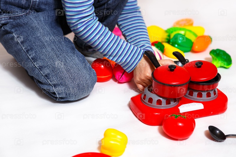 Ребенок играет с нарезанными пластиковыми овощами и фруктами на липучке, готовит еду на игрушечной плите в миске. Детская кулинария, девочка учится готовить. Белый фон, крупный план, концепция