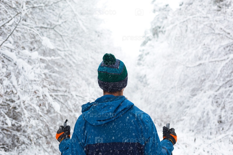 Лыжник в ветровке и шляпе с помпоном с лыжными палками в руках спиной на фоне заснеженного леса. Беговые лыжи в зимнем лесу, спорт на открытом воздухе, здоровый образ жизни